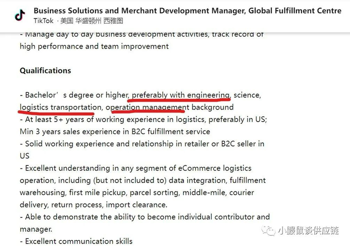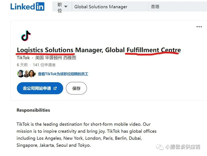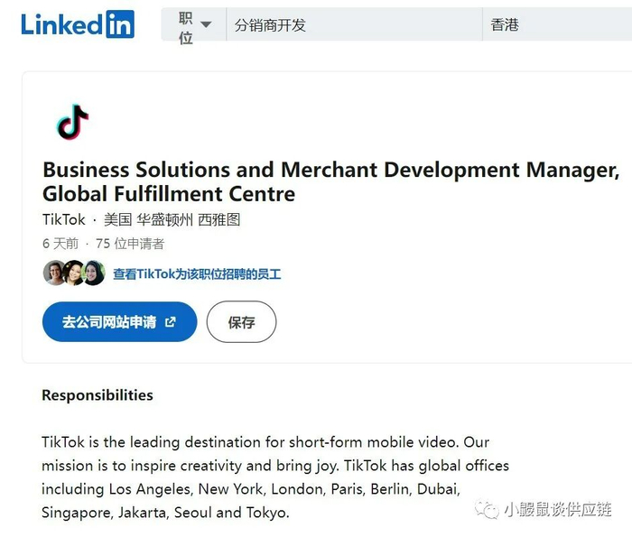 在外网Linkedin 上搜了一下,抖音在招海外岗位主要是物流和分拨中心运营类的岗位。比如美国西雅图的2个招聘岗位,其中渠道发展经理,主要职责是通过“负责履行服务的业务发展,交付业务计划并执行结果”从头开始构建其新的履行服务。另一个物流解决方案经理的职位,负责规划和设计订单履行中心,包括供应链和物流解决方案。