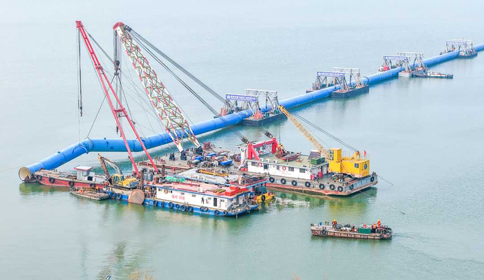 2月3日,江苏省宿迁市骆马湖水源工程施工现场,工人正在进行沉管作业。
