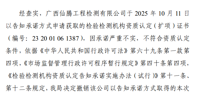 中国质量新闻网讯 据广西壮族自治区市场监督管理局网站消息,近日,该局发布关于撤销广西仙腾工程检测有限公司检验检测机构资质认定扩项证书的通告(2026年第16期)。